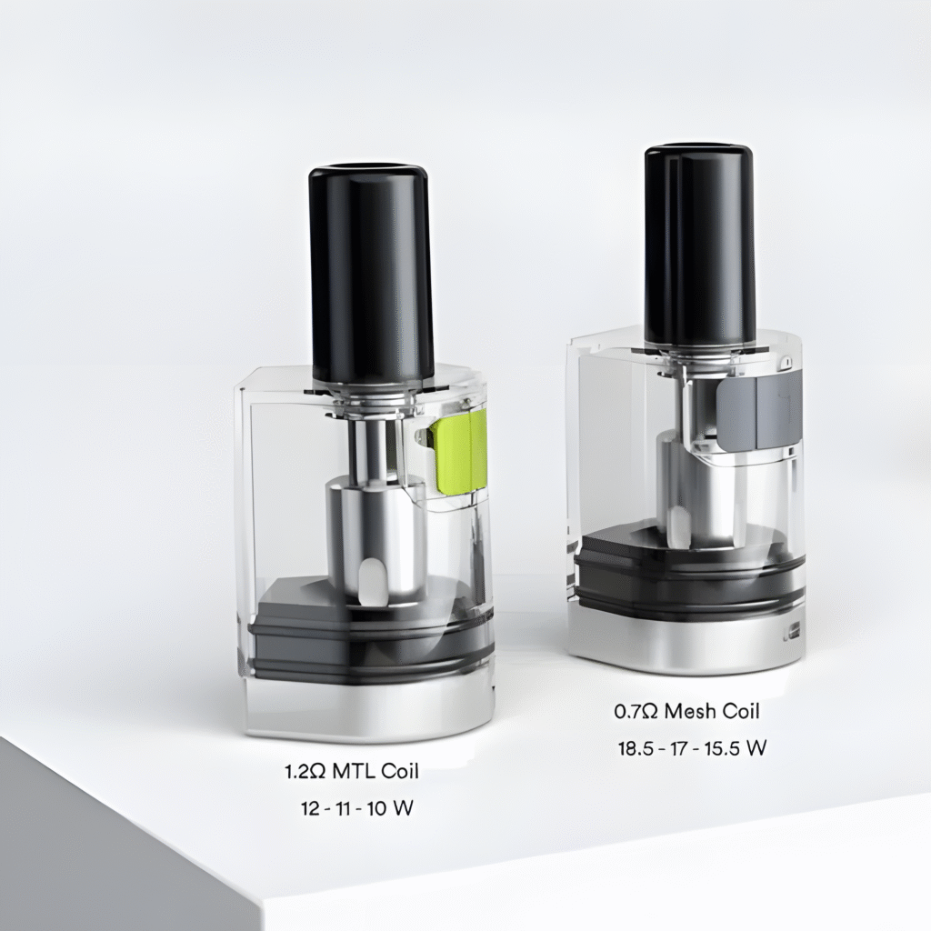 3.5ml 大容量煙彈 設計,減少頻繁注油麻煩。提供 0.6Ω (14-18W) 與 1.0Ω (11-13W) 兩種電阻選項,滿足不同煙霧濃度與口感需求。