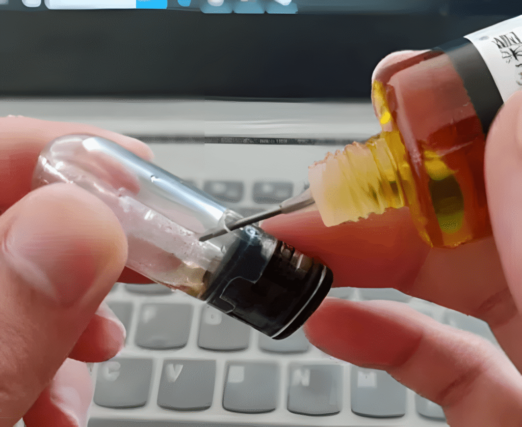 步驟1:填充煙油 使用細尖嘴注油瓶,從側邊注油孔緩慢注入2ml以下煙油。建議注入8分滿即可,避免過滿導致滲漏。